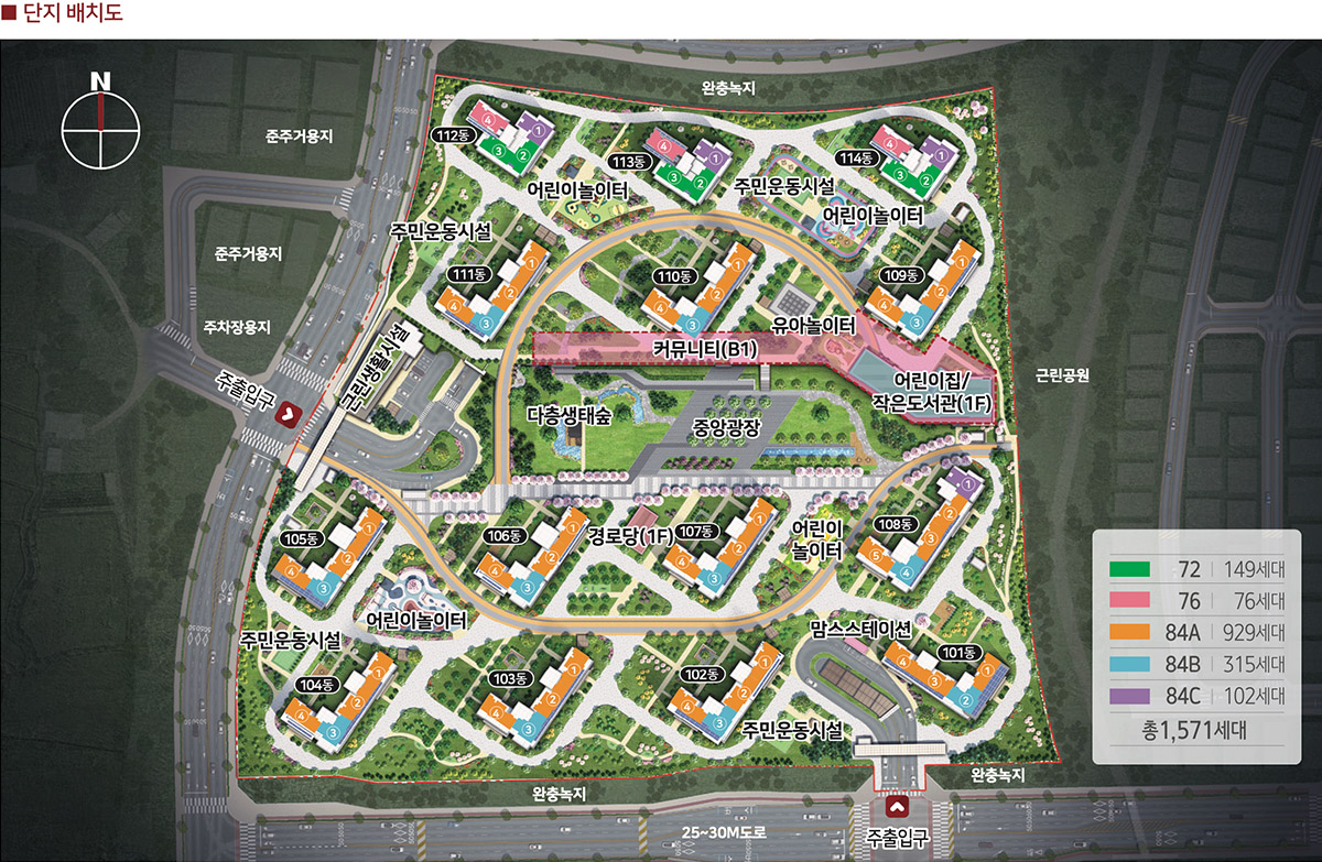 - ※ 배치도 내 대지 경계선 및 방위표는 CG 이미지 표현으로 실제와 다소 차이가 있을 수 있으며, 구획선 및 시설물의 위치, 차단기 위치, 실외기 위치, 외부계단 위치, 상가, 규모 등은 측정결 과 및 각종 기관의 평가에 따라 실 시공 시 다소 변경될 수 있습니다.